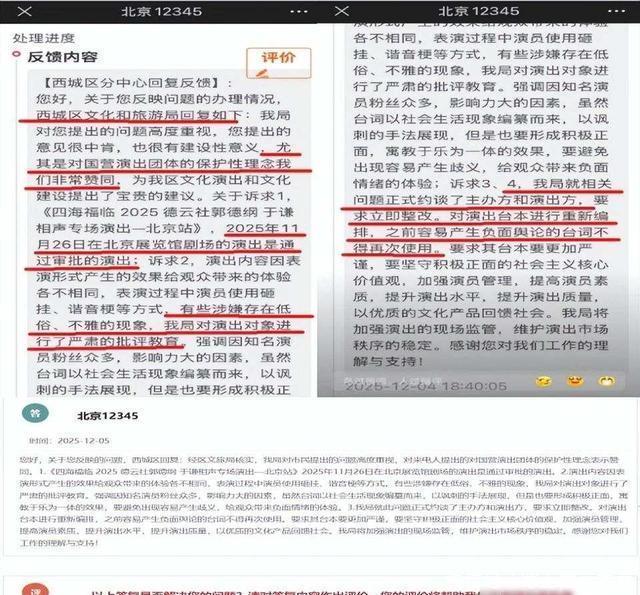 那天晚上在北京北展剧场,郭德纲和于谦表演了新段子《艺高人胆小》,名字听着正经,内容却有点出格,观众反映里面用了不少“于谦是你爹”这类梗,还有“拉出来塞嘴里”这种话,甚至提到“红灯区”“拉皮条”,让人觉得不太合适,更厉害的是郭德纲把黑粉比作抢银行的、小偷、要饭的、站街的,西城区文旅局很快回应说,节目有备案,但确实低俗,演员被批评,主办方得整改,这不是随便说说,是真的给了警告。